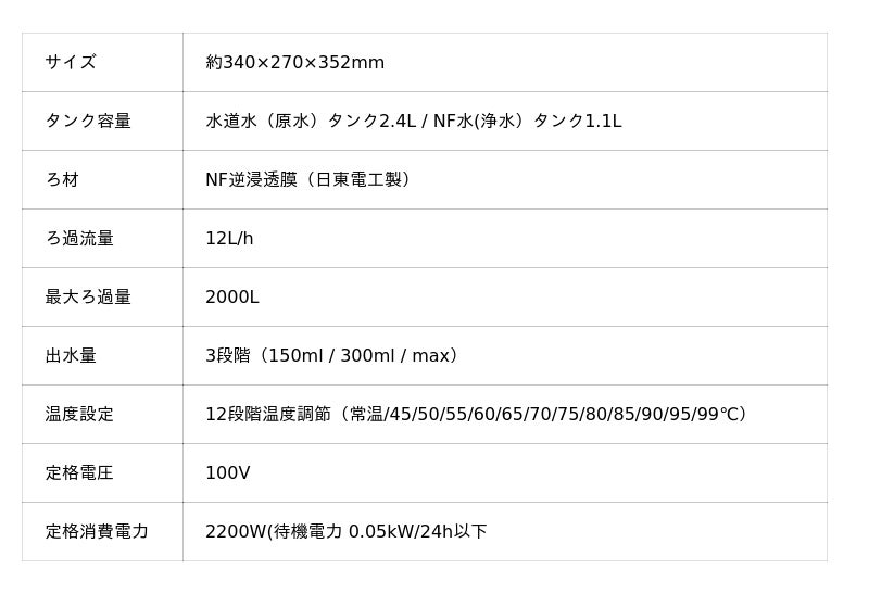 フィルターにはNFタイプの逆浸透膜フィルターを採用。細菌類などの除去率は99.9%。不純物を0.001ミクロンまで濾過するとともに、天然ミネラルは保持します。