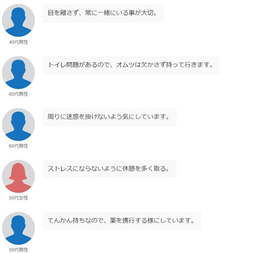 「常に一緒に行動する」「オムツや薬は必ず持参する」といった声も見られました。