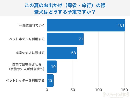 - 旅行時の愛犬の過ごし方、最多は「一緒に連れていく」。ほかには「ペットホテル」「実家に預ける」など多様な選択肢も。
