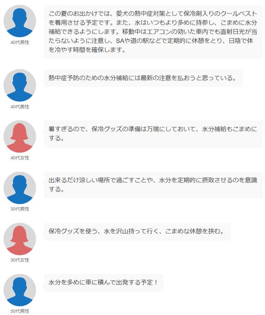 夏の旅行となると、一番気になるのは「暑さ」。愛犬の熱中症対策を徹底していくと答えた飼い主さんが多く見受けられました。