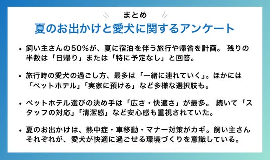 - 飼い主さんの50%が、夏に宿泊を伴う旅行や帰省を計画。残りの半数は「日帰り」または「特に予定なし」と回答。