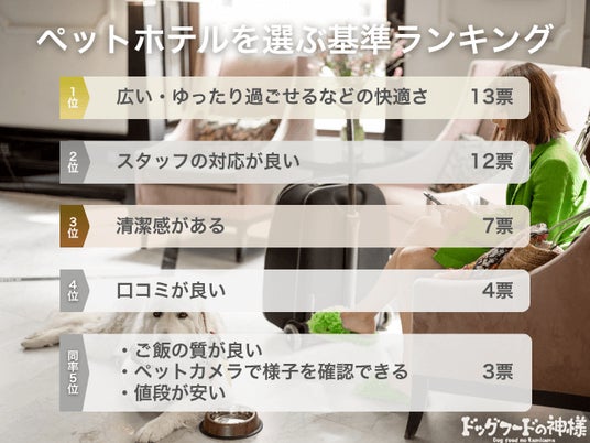 - ペットホテル選びの決め手は「広さ・快適さ」が最多。続いて「スタッフの対応」「清潔感」など安心感も重視されていた。