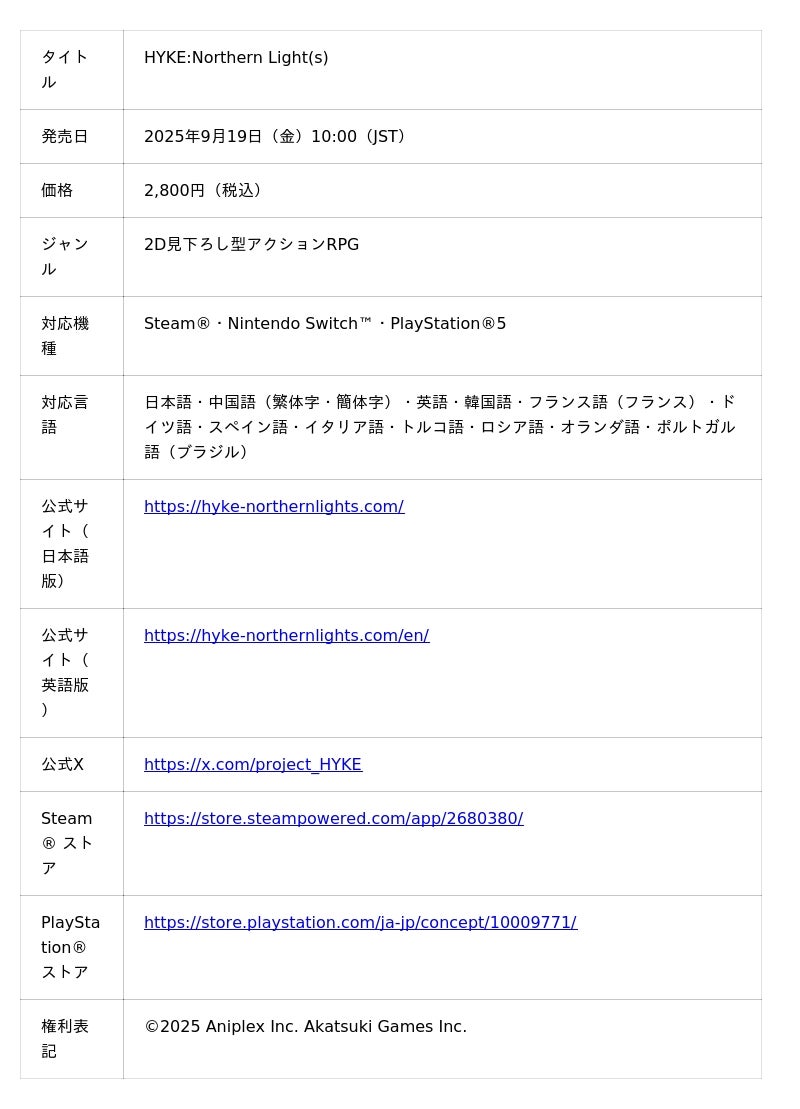 株式会社アカツキゲームス(本社:東京都品川区、代表取締役:戸塚 佑貴、株式会社アカツキ100%子会社)は、IP創出プロジェクトとして株式会社アニプレックス(本社:東京都千代田区、代表取締役:岩上 敦宏)との共同プロジェクトで手掛ける新作ゲーム『HYKE:Northern Light(s)』において、Steam(R)・Nintendo Switch(TM)・PlayStation(R)5版を2025年9月19日(金)10:00に発売することをお知らせいたします。