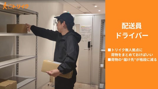 - トリイク スポットでは、宅配ドライバーが複数の荷物をまとめて置くことができ、利用者(個人)は自分の都合に合わせて、いつでも好きなタイミングで荷物を受け取ることができます。