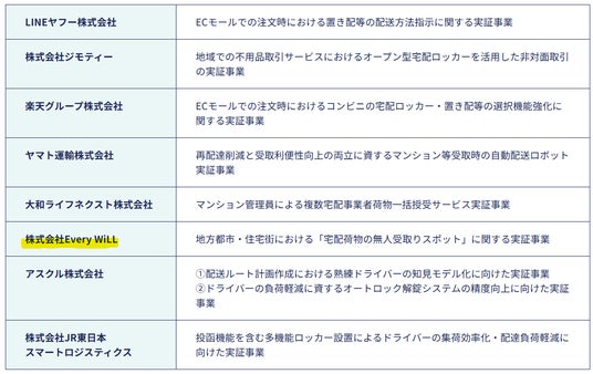 採択事業者には、LINEヤフー株式会社、楽天グループ株式会社、ヤマト運輸株式会社など、日本を代表する大手企業が名を連ねる中、株式会社EveryWiLLは唯一のスタートアップ企業として選出/採択されました。