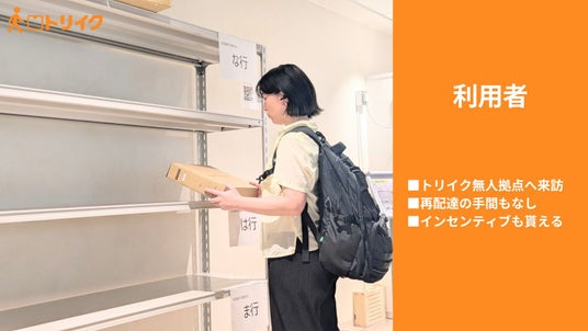 - 【賃貸住宅物件などの管理企業さま】置き配が標準化されるニュースが飛び交う中、置き配盗や置き配で自宅の留守が晒されていることが怖い・宅配ボックスが不足しており利用できない・物件のセキュリティが厳しくて置き配もできず再配達の手間ばかりかかる等といった、住民の要望に応えるために、賃貸物件の空きスペースや空き部屋等をトリイクスポットとして活用することで、住民の利便性を向上させることができる(新規入居者の増加や、既存入居者の退去防止等)。