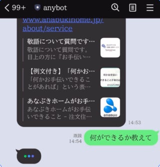 https://chatgpt.anybot.me/2023年リリース。ChatGPTに自社のFAQなどを組み込む事で、ChatGPTの弱点をカバーし、あたかも人間が回答したような自然な会話での接客を実現します。