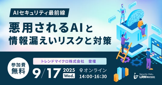 LRM株式会社(本社:兵庫県神戸市、代表取締役CEO:幸松哲也)、トレンドマイクロ株式会社(本社:東京都新宿区、代表取締役社長:エバ・チェン)、株式会社アズジェント(本社:東京都中央区、代表取締役社長:杉本隆洋)は、2025年9月17日(水)14時から、悪用されるAIと情報漏えいリスク対策を解説する無料オンラインセミナーを開催いたします。