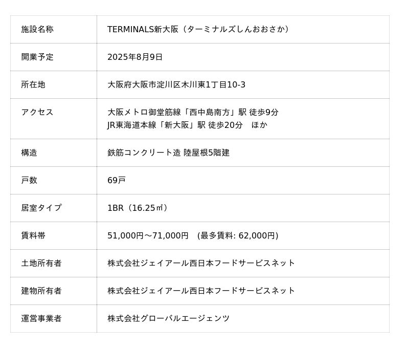 グローバルエージェンツ×JR西日本グループ共同プロジェクト第三弾!大阪市内初のソーシャルアパートメント「TERMINALS新大阪」が、2025年8月9日に開業