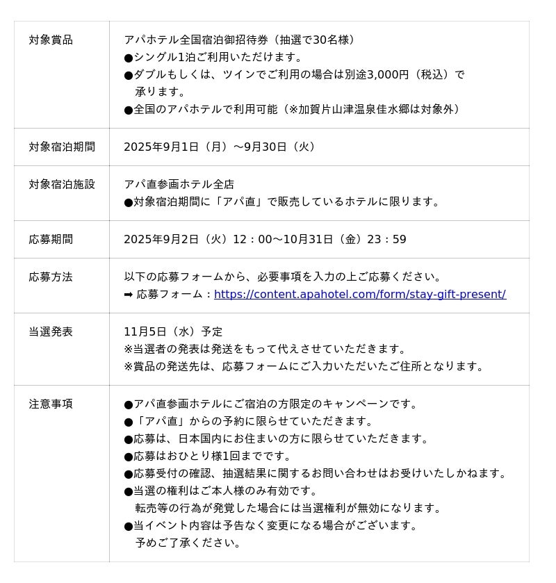 【9月ご宿泊のお客様限定】アパ直参画ホテルに泊まって当てよう! 抽選で30名様にアパホテルの宿泊ご招待券プレゼント!