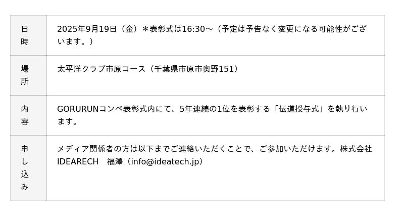 2021年から実施している女性アイドルとゴルフに関するランキング調査。2025年で5年連続の1位を獲得した山内鈴蘭さんを、本ランキングが定めている “殿堂入り”と認定し、レリーフを贈呈する伝道授与式を山内鈴蘭さんが主催するゴルフコンペ「GORURUN」にて実施いたします。(メディア関係者の方は事前に申請いただくことで、ご参加可能です。)<概要>