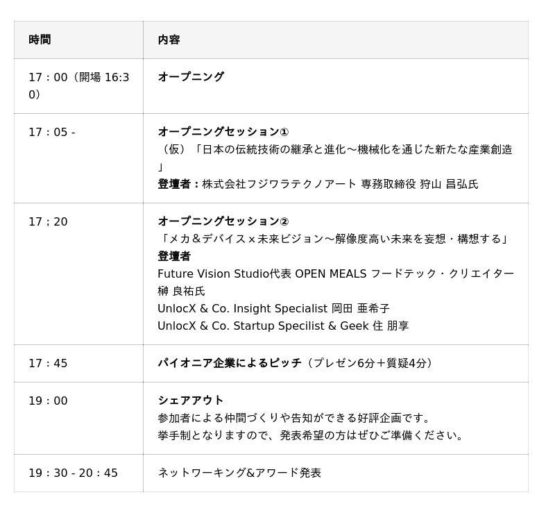 技術と集合知で食の可能性をUNLOCKし、食農を軸とした新産業創造を目指す株式会社UnlocXは、テックプランター等の企画・運営を通して科学技術を社会実装することに取り組む株式会社リバネスと共催で「Foodtech Venture Day NEO Vol.4−メカ&デバイス×食農の未来」(以下FVD NEO)を8月26日(火)に開催します。FVD NEOは、先進的な技術・アイデアで新たな食の未来の創造をめざすパイオニア(スタートアップやベンチャー)が登壇し、審査員企業である大手事業者との協業を後押しするピッチイベントです。第4回目となる今回は、日本が誇る強みのひとつであるメカ&デバイスをテーマに食農の未来を探ります。