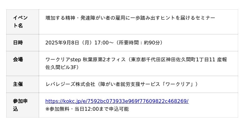 本セミナーは、9月の「障がい者雇用支援月間」にあわせて実施され、精神・発達障がいのある方の雇用や定着支援に関する課題と実践について、専門家・企業・支援事業者の立場から議論するトークセッション形式で行われます。