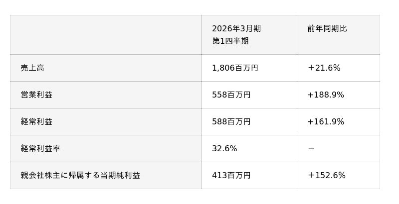当連結会計年度の業績は、売上高1,806百万円(前年同期比21.6%増)、営業利益558百万円(同188.9%増)、経常利益588百万円(同161.9%増)、親会社株主に帰属する当期純利益413百万円(同152.6%増)となりました。