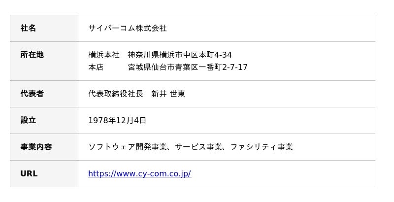 サイバーコムは 1978 年の創業以来、ミッションクリティカルな通信分野での豊富なソフトウェア 開発実績を活かし、AI、RPA、IoT 等を活用したソフトウェア開発など、お客様の多様なニーズに応え 続けております。また、クラウドサービスを活用したシステム構築、情報システムやネットワークの セキュリティを確保する SI サービスに加え、DX や業務効率化を支援するプロダクト・ソリューショ ンを提供しており、国内 7 拠点(横浜、仙台、東京、新潟、名古屋、刈谷、福岡)より、お客様の ビジネスの成長と変革を支援します。