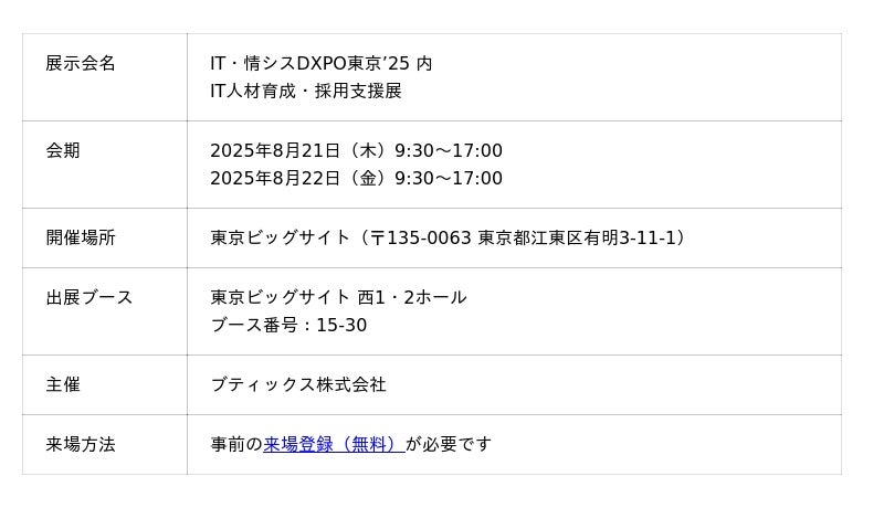 プログラミングスクール『侍エンジニア』を運営する株式会社SAMURAI(本社:東京都港区、代表取締役:羽田 吾立)は、2025年8月21日(木)・22日(金)に東京ビッグサイトで開催される展示会『IT・情シスDXPO東京’25』に出展いたします。