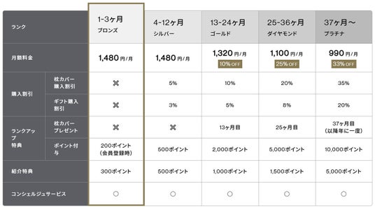 サブスクリプションの利用期間によって、会員ランクが自動的にアップしていきます。会員ランクが上がることにより、月額料金が最大33%割引になるほか、ランクアップのタイミングでポイント付与や専用枕カバープレゼント、特定商品の割引購入などの特典を受けることができます。