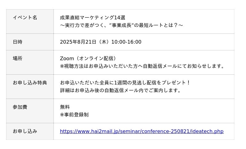 ■今後のセミナー情報|2025年8月21日(木)10:00-16:50「成果直結マーケティング14選~実行力で差がつく、“事業成長“の最短ルートとは?~」に登壇!