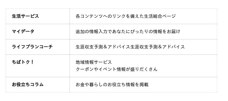 ライフプランのシミュレーションを通じた生活設計のサポートをはじめ、当行が運営する地域情報サイト「ちばトク!」に掲載している地域企業、クーポン、イベントなどの情報、お金や暮らしに関するお役立ち情報をお届けします。「生活サービス」では閲覧状況や「マイデータ」へ追加の情報をご入力いただくことで、お客さまに合わせた情報を発信してまいります。