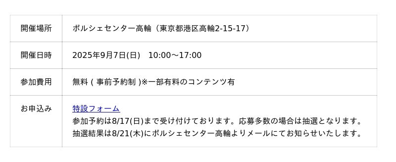 ※本イベントはポルシェセンター高輪ショールーム内での開催となります。ご来場の際にはマナーウェアの着用等の注意事項がございますので、お申込みの際は特設フォーム内の注意事項を必ずご確認ください。