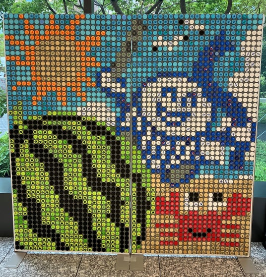 ・キャップアート多くの来場者の方にご協力いただき、PETボトルキャップを使ったモザイクアートを作り上げました。今年のデザインは、「スイカ割り」。2,500個ものキャップを使った大作が完成しました。