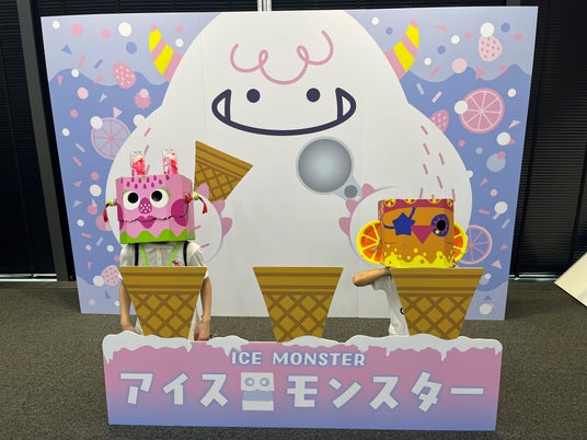 ・段ボールを使った被り物「アイスモンスター」、フォトスポットアイスクリームをテーマにした涼しげなデザインの被り物(段ボール)と、それにぴったりのフォトスポットを用意しました。アイスのコーンを模したパネルの前で、皆さんアイスクリームになりきって楽しく写真撮影をされていました。また、オリジナルの「ミニモンスター」を作ることができる工作コーナーも人気でした。