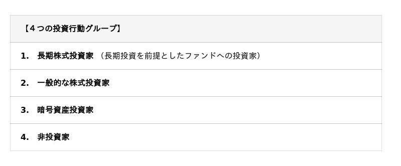 投資経験の有無と投資対象が、人生満足度や生きがい等の心理的ウェルビーイングに与える影響を検証するものです。検証にあたっては4つの投資行動グループに対し、5つの心理的項目について測定しました。
