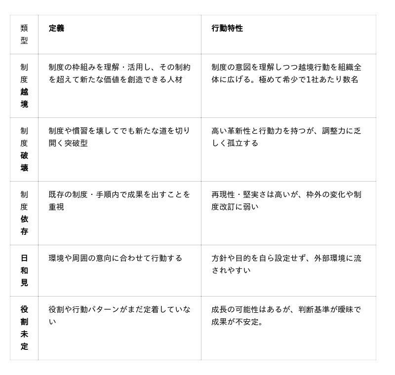 詳細は【組織で働く人材を5類型に分類し、成長の道筋を提示】を参照。