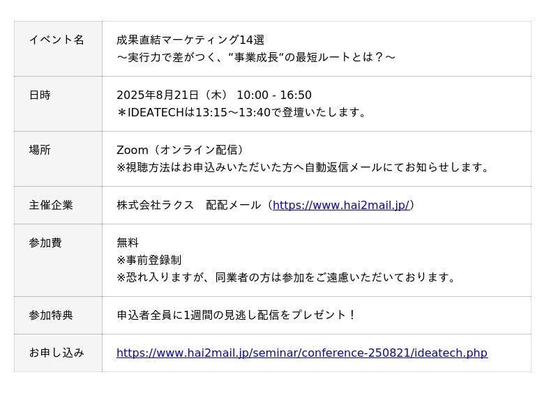 ファクトに基づいたコンテンツ開発とマーケティング支援を行う、株式会社IDEATECH(本社:東京都港区、代表取締役社長:石川友夫、以下 IDEATECH)は、株式会社ラクス(所在地:東京都渋谷区、代表取締役:中村崇則)のメールマーケティングサービス「配配メール」と共催するカンファレンス「成果直結マーケティング14選」に、2025年8月21日(木)に登壇いたします。