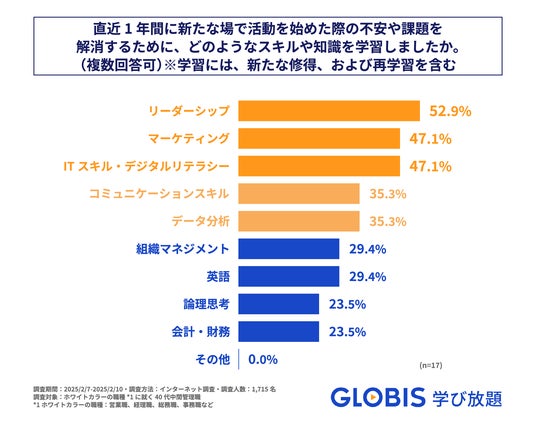 また、「不安・課題に感じることに関して学習をした」と回答した人に対して、何を学習したかを聞いたところ、最も多かったのが「リーダーシップ」(52.9%)、続いて同率で「マーケティング」と「ITスキル・デジタルリテラシー」(47.1%)、「コミュニケーションスキル」という結果となりました(図6)。