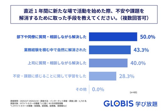 直近1年間に新たな場で活動を始めた際の不安や課題が「完全に解消された」または「大部分が解消された」と回答された方に「不安や課題を解消するために取った手段」を尋ねたところ、1位が「部下や同僚に質問・相談しながら解決した」で50.0%、2位が「業務経験を積む中で自然に解消された」で43.3%、3位が「上司に質問・相談しながら解決した」で40.0%、4位が「不安・課題に感じることに関して学習をした」で28.3%という結果になりました。