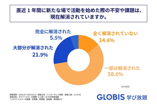 新たな場で活動を始めてから6カ月以上が経過したと回答した人に、当時の不安や課題は解消されたかを尋ねたところ、最も多かったのは「一部は解消された」で58.0%でした。「大部分が解消された」(21.9%)と「完全に解消された」(5.5%)の合計は3割未満に留まり、7割以上の人が、新たな場で活動を始めてから6カ月以上経過しても、悩みや課題が解消されていないということが判明しました(図4)。
