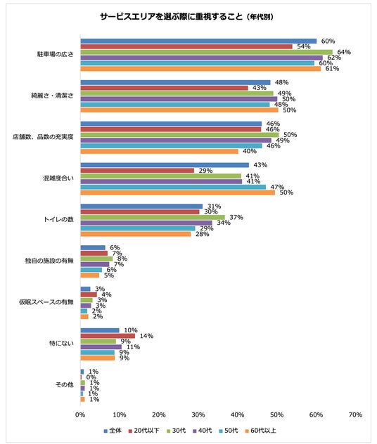 年代別で見ると、「食事」を目的にサービスエリアを利用する人が多かった60代以上は、2人に1人が「混雑度合い」を重視しているのに対し、20代以下は3割を下回っており、年代による違いがみられました。