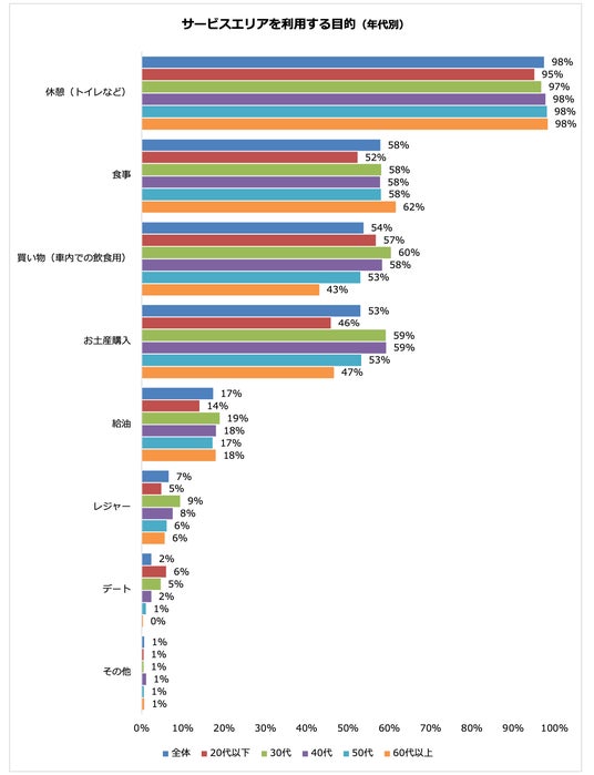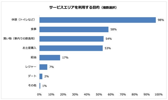 サービスエリアの利用目的は、「休憩」が98%と圧倒的で、次いで「食事」58%、「買い物(車内での飲食用)」54%という結果となりました。