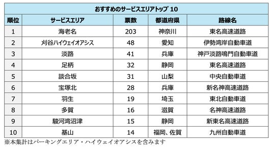 おすすめしたいサービスエリア(パーキングエリア・ハイウェイオアシスを含む)は、最も利用者数が多く※1、ギネス記録※2に認定されたメロンパンなどのグルメで有名な「海老名」が203票でダントツでした。2位には、天然温泉や高級感あふれるデラックストイレなど設備が充実している「刈谷ハイウェイオアシス」48票、3位には大観覧車から明石海峡大橋などが一望できる「淡路」41票が選ばれました。
