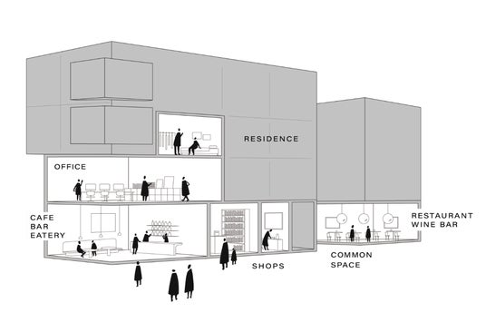 2階から5階は、オフィスと住居区画が混在したフロアで、あえて住む人と働く人が共存する設計に。1階にはカフェバーやレストラン、本屋などのショップが集まり、地域住民や訪問者、入居テナント同士が自然に交流できる空間を提供しています。