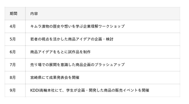本プログラムの第一弾として、宮崎県の老舗漬物企業と学生の共創で活動を行い、8月27日にATOMicaのオフィスで成果発表会、9月3日から5日までKDDI高輪本社、GINZA456で販売イベントを開催します。