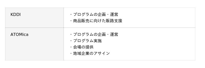 ATOMicaは、全国でソーシャルコワーキング(R)事業を展開するスタートアップ企業です。これまで地域や大学・自治体と連携し、人と人をつなぐ共創の場づくりを手がけてきました。KDDIはこれまで、自治体や教育機関などと連携し、地域の未来を担う人財育成に関する取り組みを幅広く推進しています。
