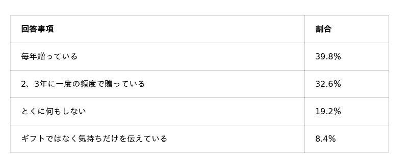 また、「ギフトではなく気持ちだけを伝えている」が8.4%という回答からは、必ずしも“物を贈ること”が重要なのではなく、“感謝の気持ちを伝えること”が本質と捉えている人たちもいることがうかがえます。