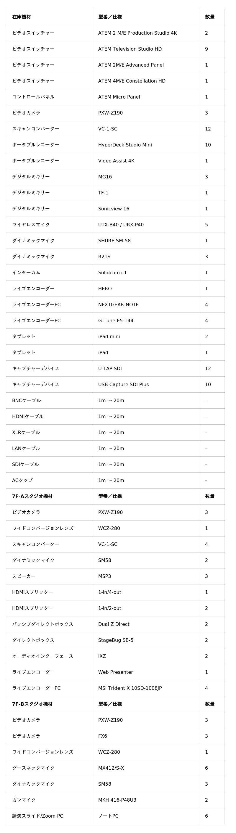 本オプションのラインナップには、映画・CM撮影でも使用される高性能シネマカメラ Sony FX6、最新の映像制作プラットフォーム Panasonic KAIROS、高音質かつ多機能なデジタルミキサー TASCAM Sonicview 24 など、プロフェッショナル仕様の機材をご用意しています。