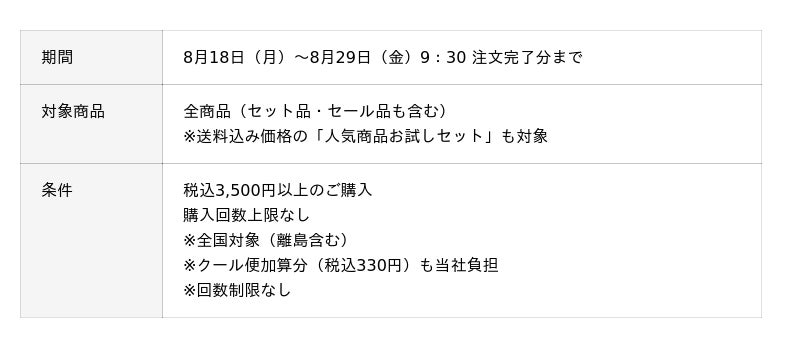 好評につき今年2回目の開催。本日8月18日(月)から8月29日(金)まで全商品の中から税込3,500円以上のお買い上げで送料が当社負担になるお得なキャンペーンです。