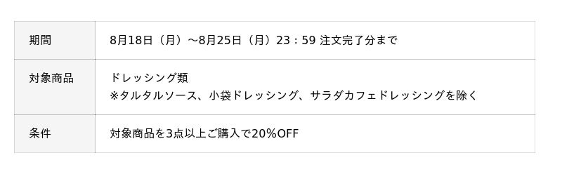 【公式通販サイト】8月18日から2大キャンペーンセールがスタート!好評の送料当社負担キャンペーン&ドレッシングの日記念セール~税込3,500円で送料当社負担/対象ドレッシング類3点購入で20%OFF~