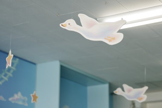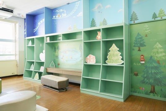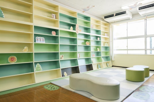 デザインコンセプトは「おはなしの森」。子どもたちが安心して過ごせる場所を作りたいという想いから、自然を意識した緑色が多く使われているほか、「絵本のまち」の視点も踏まえて、童話に登場する様々な可愛らしいキャラクターも配置されています。