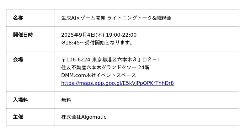 株式会社Algomatic(本社:東京都港区、代表取締役社長:大野 峻典、以下Algomatic)が開発・提供する、独自の翻訳AIを活用したゲーム特化翻訳サービス『DMM GAME翻訳』は、2025年9月4日、『生成AI×ゲーム開発 ライトニングトーク&懇親会』を開催することをお知らせいたします。