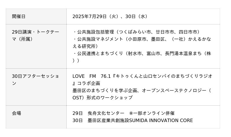 今年度初開催となる今回は、2025年7月29日(火)、30日(水)に東京都墨田区で開催いたしました。東京開催は2021年以来4年振りとなり、全国148団体・221名(現地94名、オンライン127名)の方にご参加いただきました。初日は「公共施設包括管理」「公共施設マネジメント」「公民連携とまちづくり」をテーマにした基調講演やパネルディスカッションを行い、2日目のアフターセッションでは、福岡のFMラジオ局「LOVE FM」のコラボ企画として墨田区のまちづくりを学ぶ企画やオープンスペーステクノロジー(OST)形式のワークショップでの対話を行いました。