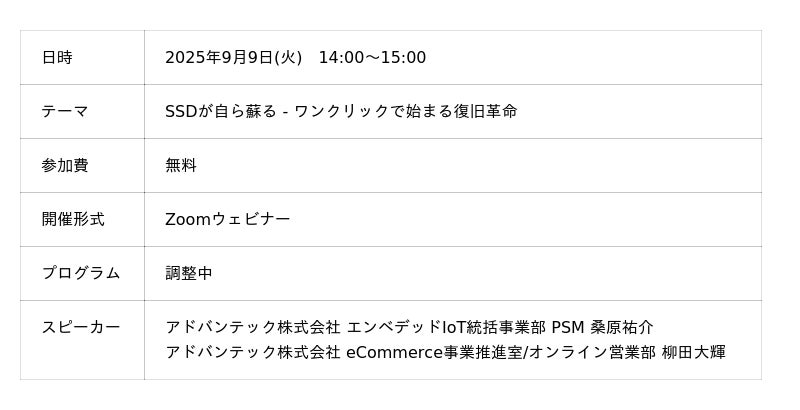 アドバンテック株式会社は、2025年9月9日 (火) オンラインにて開催されるウェビナー「SSDが自ら蘇る - ワンクリックで始まる復旧革命」を開催する運びとなりましたので、ご案内申し上げます。