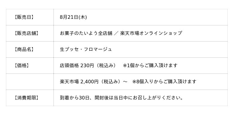 株式会社太陽社(所在地:千葉県匝瑳市飯倉293、代表取締役:片岡正裕)が展開する千葉県で長年愛される菓子店「お菓子のたいよう」は、8月21日(木)に、とろける絹のくちどけ「生ブッセ・フロマージュ」を3年ぶりに数量限定で復活販売いたします。