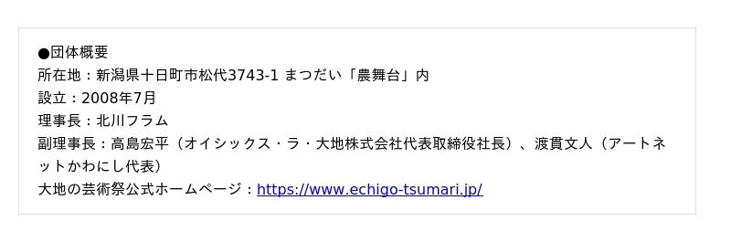 「大地の芸術祭」で生まれた作品や施設、プロジェクトを通年事業として運営し、越後妻有を魅力ある地域にしていくために設立されました。地元出身者や県内外からの移住スタッフで構成され、3年に1度の芸術祭はもちろん、合間2年間の作品メンテナンス、企画展・イベント・ワークショップの開催、農業、ツアーの実施、グッズやお米の販売、食宿泊施設運営、それら全ての広報や誘客促進を主な業務とし、地元の方々や作家、ボランティアの皆さんに助けられながら従事しています。