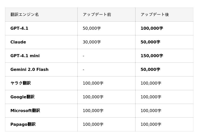 さらに、一部の翻訳エンジンで一度に翻訳できる文字数の上限がアップしました。