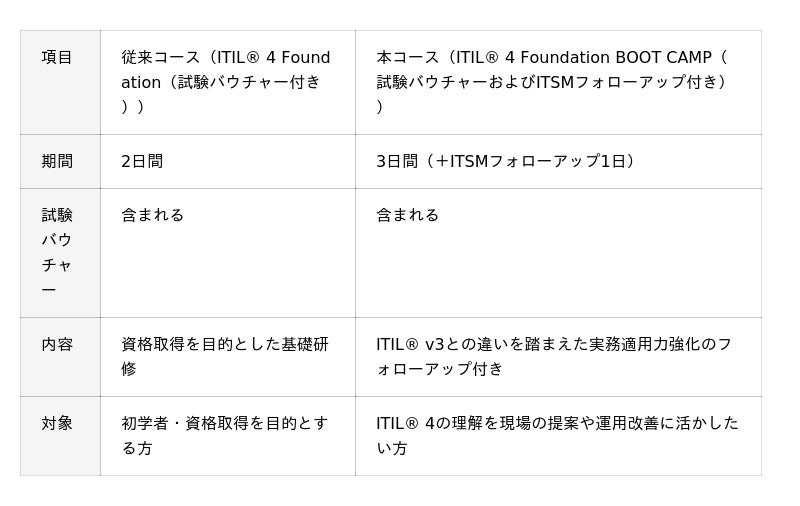 当社ではこれまで、ITIL(R) 4の基礎を体系的に学び、国際資格の取得を目指す「ITIL(R) 4 Foundation(試験バウチャー付き)」を提供してきました。本コースは、その標準コースをベースに、ITIL(R) v3で培われたプロセス思考を補完的に取り入れ、「理論の習得」に加え「現場での適用方法」にも焦点を当てた新たな研修プログラムとして開発されました。